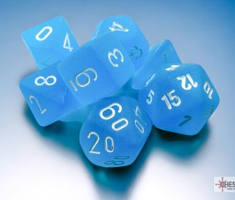 Frosted Mini Polyhedral Dice Set – Caribbean Blue/White is a stylish and compact 7-dice set, perfect for tabletop role-playing games. The frosted Caribbean blue finish combined with clear white numbering ensures excellent readability and an elegant look.