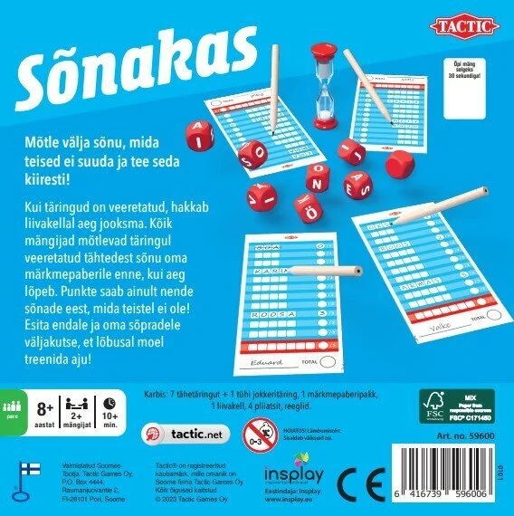 Sõnakas on tempokas ja kaasahaarav sõnamäng, kus kiirus ja loovus viivad võiduni! Kui täringud on veeretatud, pööratakse liivakell ümber ning aeg hakkab jooksma. Kõik mängijad kirjutavad märkmepaberile sõnu, kasutades täringutel veeretatud tähti – enne kui aeg otsa saab.